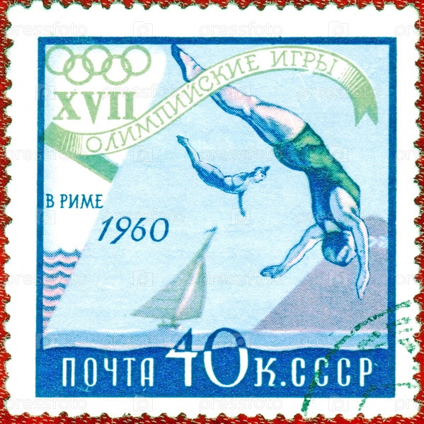 СССР, около 1960 года: почтовая марка с изображением прыжков в воду из серии 'XVII Олимпийские игры в Риме, 1960'