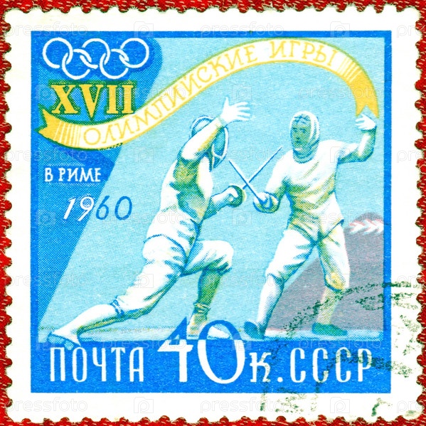 СССР, около 1960 года: почтовая марка с изображением фехтования, из серии 'XVII Олимпийские игры в Риме, 1960'