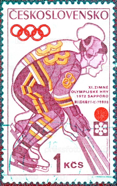 Чехословакия - около 1972 года: почтовая марка с изображением хоккеиста и надписью 'XI зимние Олимпийские игры 1972, Саппоро'