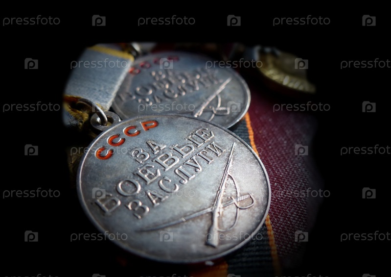 Медали `За боевые заслуги` на фоне георгиевской ленты. Награды солдата. Реликвия. Память. 9 мая - День Победы