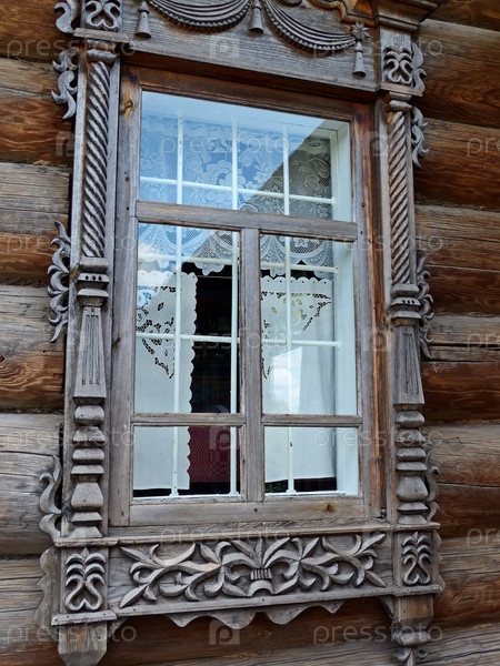 Резные оконные наличники. Фасад постоялого двора (1897 г.). Уральская роспись – уникальный народный промысел. Музей-заповедник деревянного зодчества и народного творчества. Нижняя Синячиха, Россия