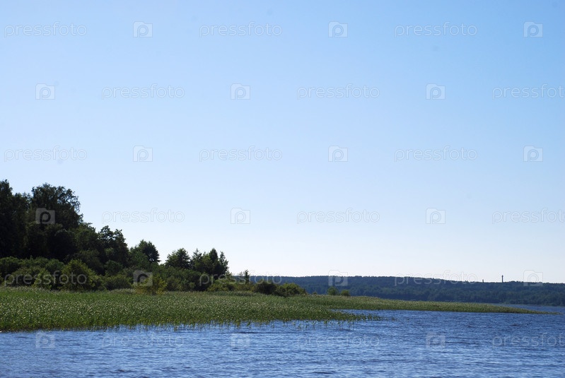 Часть побережья заросла камышом. Летний день, Голубая вода реки со светлыми волнами и часть берега, заросшая зелеными деревьями, кустами и травой, лес на другой стороне реки