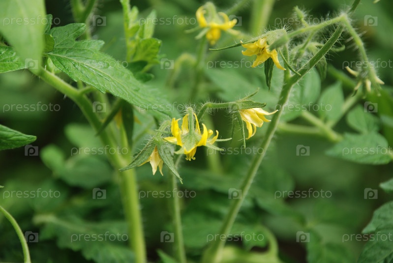 Желтые цветы помидора на зеленом стебле