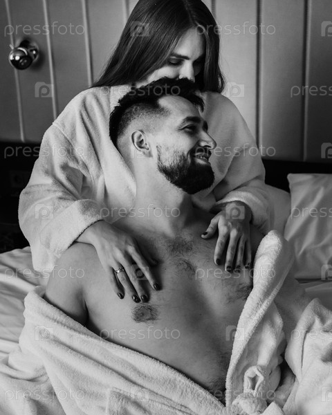 Молодая сексуальная любящая пара в халатах отдыхает на кровати в отеле. Черное и белое