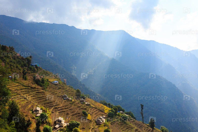 Азиатская горная деревня и террасные поля на рассвете Непал, Гималаи, заповедник Аннапурна