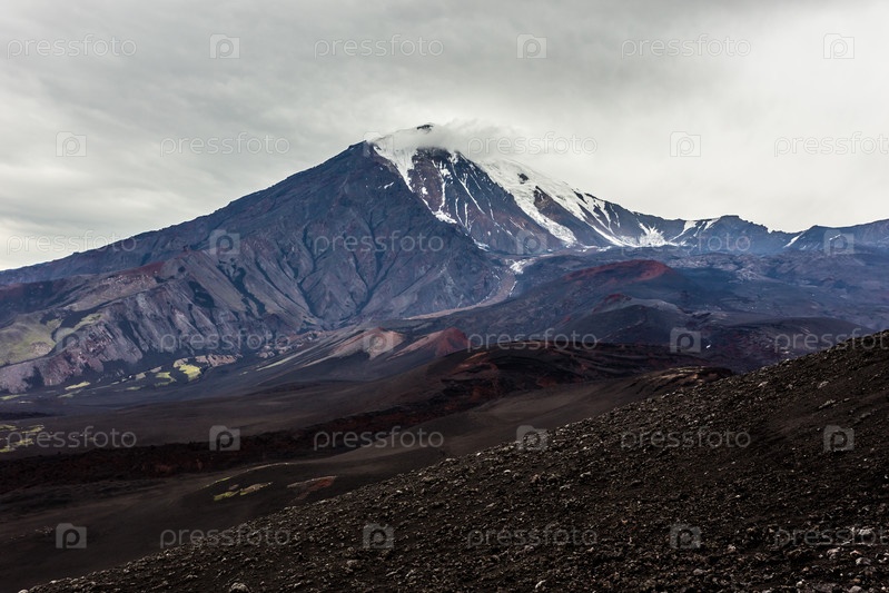Вид на вулкан Острый Толбачик в пасмурную погоду, полуостров Камчатка, Россия