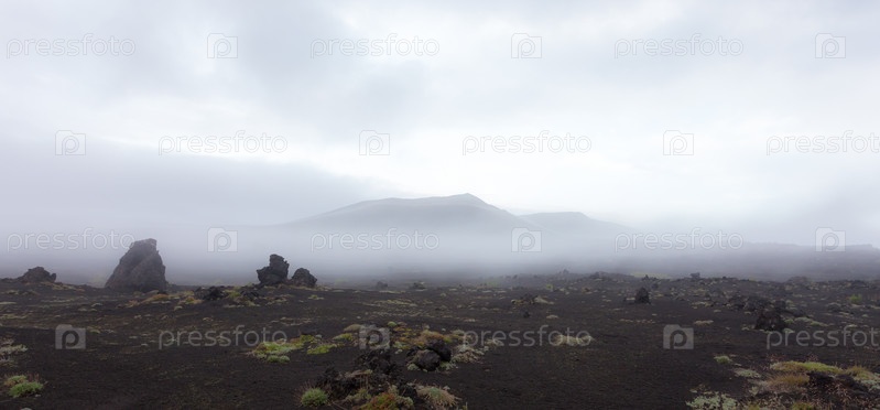 Туманный вулканический пейзаж у вулкана Толбачик в пасмурную погоду. Полуостров Камчатка, Россия
