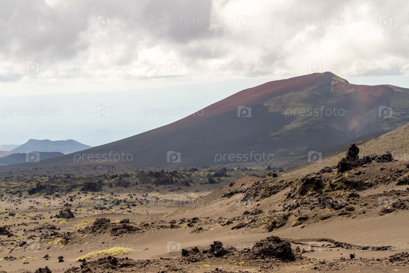 Безжизненный вулканический пейзаж в пасмурную погоду. Полуостров Камчатка, Россия