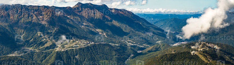 Панорамный вид на курорты Роза Хутор, Газпром, Альпика и Горки Город