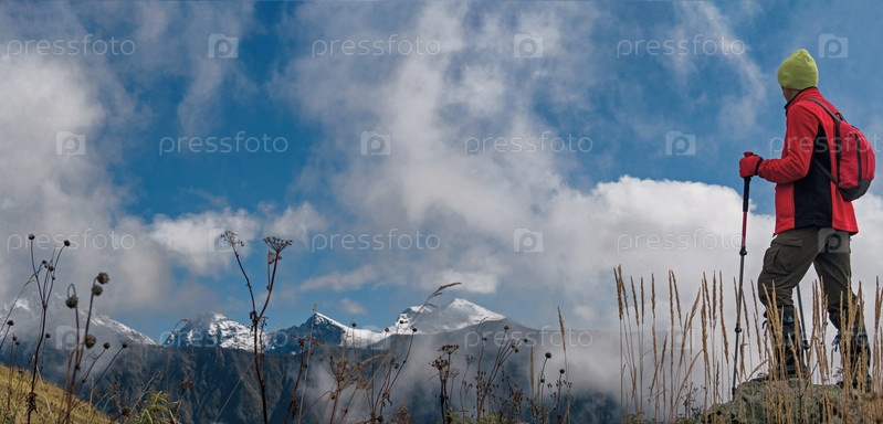 Молодой активный мужчина с трекинговыми палками и рюкзаком