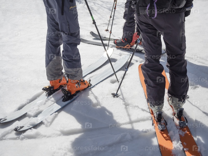 Группа активных людей на горных лыжах и сплитборде
