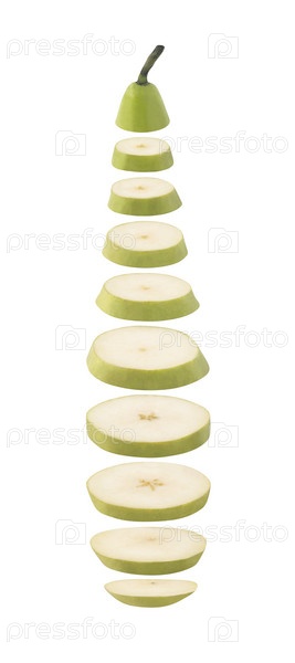 Слоистые ломтики зеленой груши на белом фоне