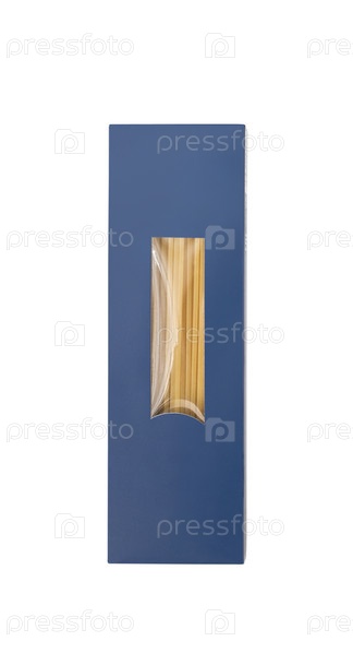 Сырые спагетти в упаковке с окном на белом фоне