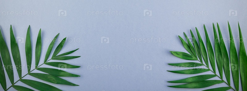 Тропические пальмовые листья на синем фоне серой бумаги