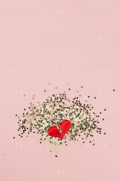 Вид сверху на разбитое сердце конфетти с золотыми звездами