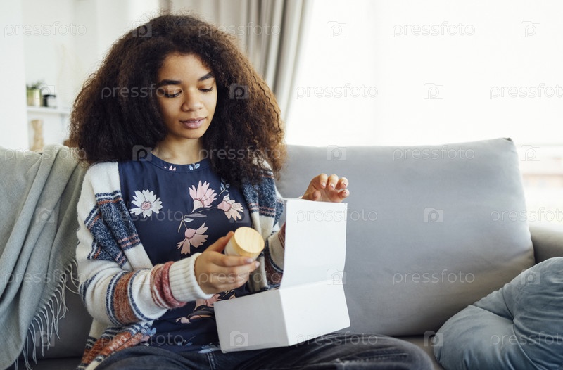 Портрет улыбающейся афроамериканки получил посылку, распаковав картонную коробку с косметикой