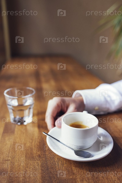 Мужская рука держит белую чашку кофе эспрессо. Фото крупным планом с выборочным фокусом