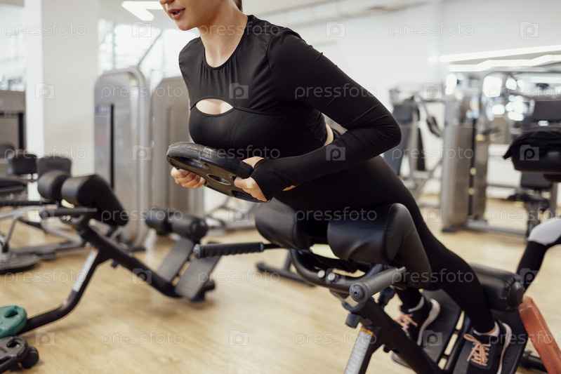 Привлекательная брюнетка спортивная женщина делает упражнения на тренажере в фитнес-клубе