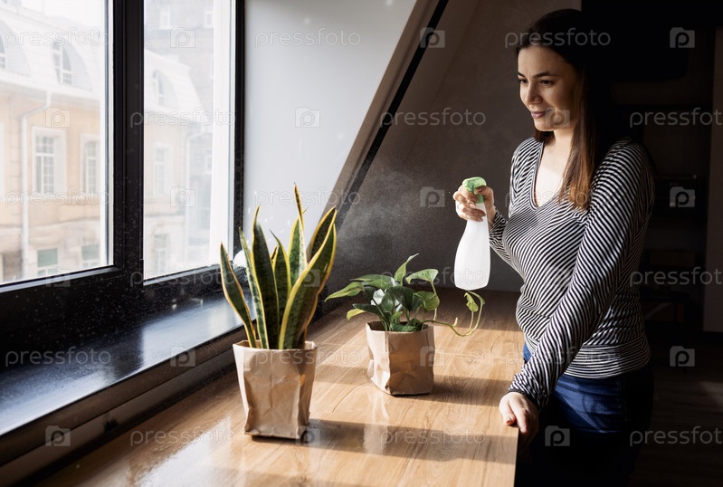 Молодая брюнетка поливает растения и цветы у окна. Ботаническое хобби. Садовник комнатных растений ухаживает за растениями в горшках. Домашний флорист. Забота о новой жизни. Концепция дня земли