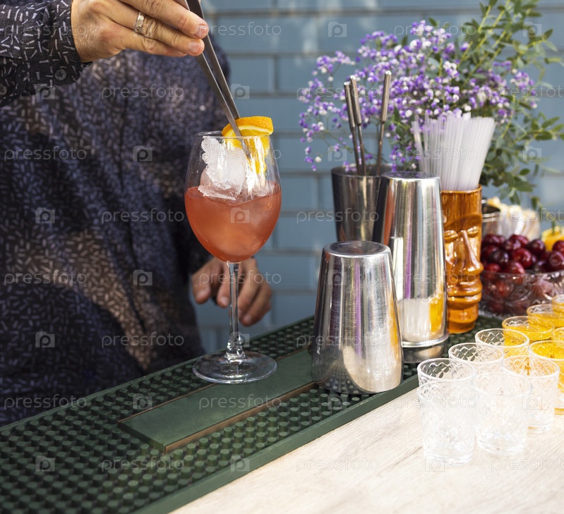 Стаканы коктейлей в баре. Бармен наливает бокал игристого вина с красным алкоголем