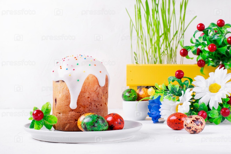 Пасхальная композиция на белом столе. Пасхальный кулич с сахарной глазурью, цветными карамельными яйцами, цветами и проросшей травой в желтой коробке. Копировать пространство