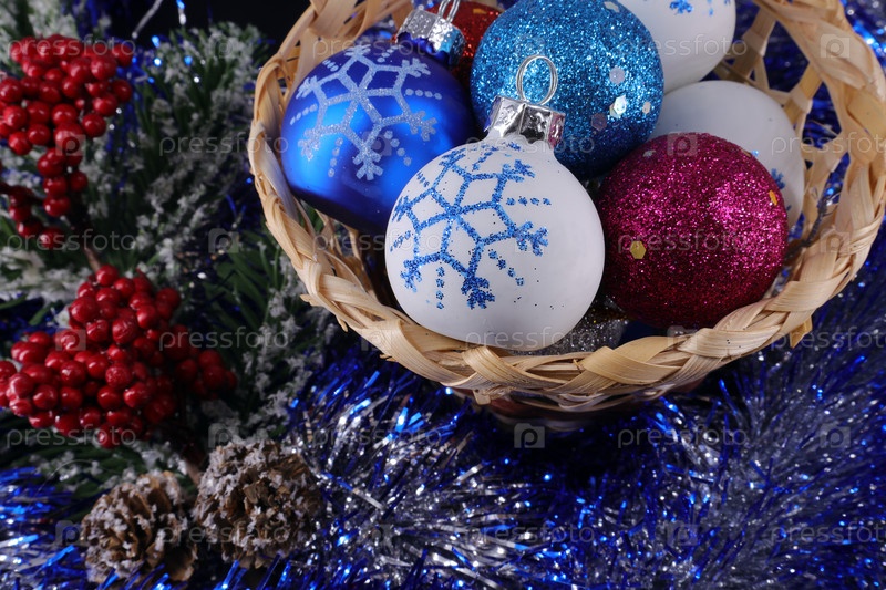 Украшения для празднования нового года - елочные шары в плетеной корзине, мишура, красные ягоды, еловая ветка
