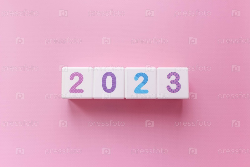 Кубики с красочными цифрами 2023 на розовом фоне. Новый год, календарь. Цифры подряд
