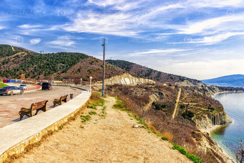 Пейзаж высокого крутого морского побережья с проходящей через него автомагистралью