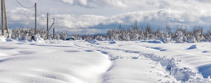 Полевая деревенская дорога покрыта глубоким снегом