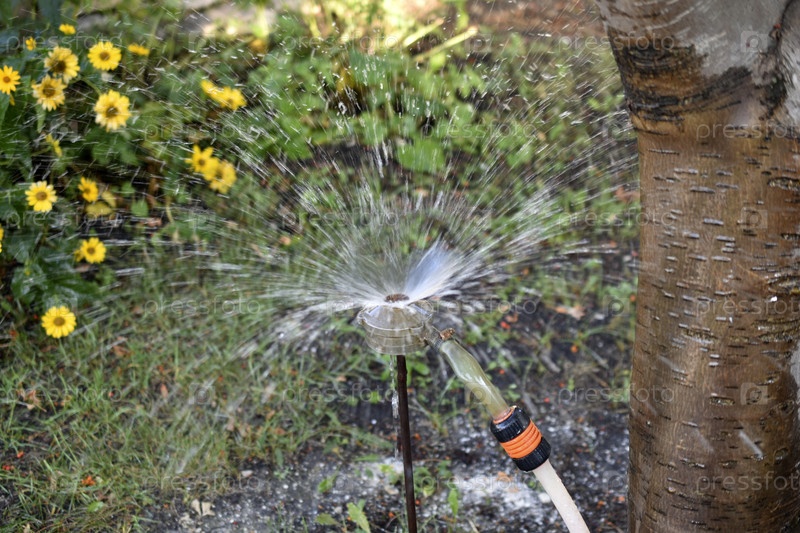 Полив фонтана в саду летом