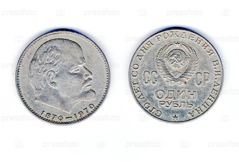 Памятный советский рубль (аверс и реверс) с изображением и надписью "100 лет В. И. Ленину, 1870-1970, СССР". Изолировано на белом фоне