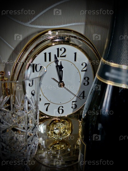 На часах последние минуты старого года. Хрустальный бокал и шампанское, новогодняя ночь. Размытый фон