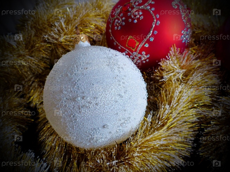 Белый и красный шар на яркой мишуре. Праздничный фон. Новый год и Рождество. Выборочный фокус
