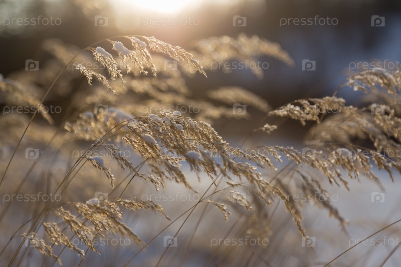 Заснеженные желтые колоски в подсветке крупным планом с боке