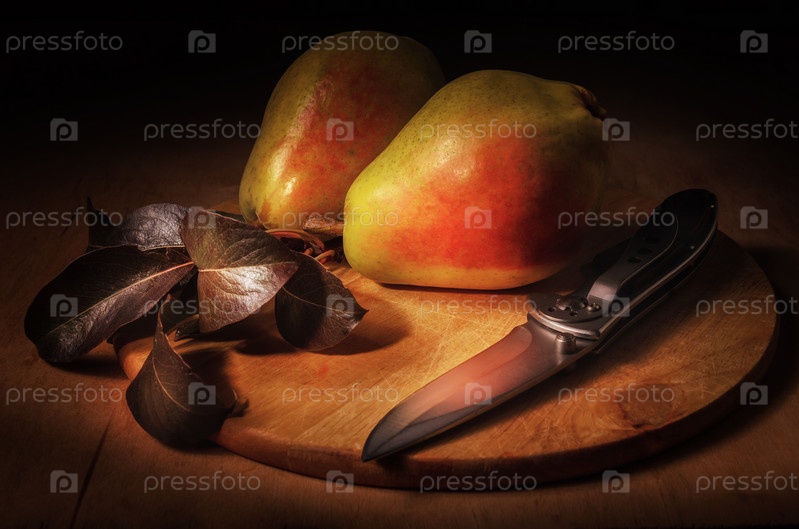 Натюрморт с грушами на деревянном фоне