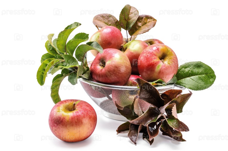 Спелые красные яблоки в дуршлаге на белом фоне