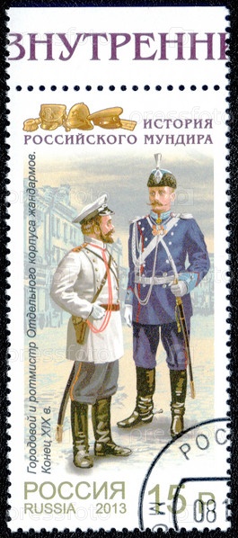 Россия, около 2013 года: почтовая марка с изображением городской формы и ротмистра Отдельного корпуса жандармов в конце XIX века