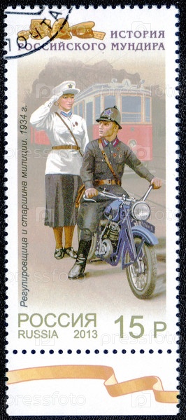 Россия, около 2013: Почтовая марка с изображением формы регулировщицы и старшины милиции в 1934г. Серия "История русского мундира"