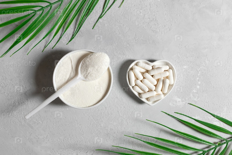 Коллаген на сером фоне с пальмовыми листьями. Коллагеновый порошок и таблетки. Добавка на рыбной или растительной основе. Вид сверху, плоская планировка