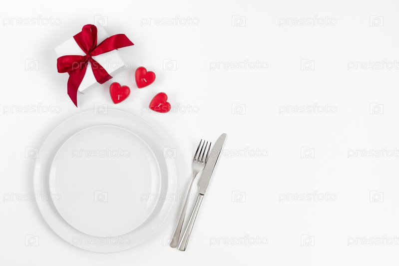 День святого Валентина или романтический ужин фон. Праздничная романтическая сервировка стола со свечами в форме сердец и подарком на белом фоне