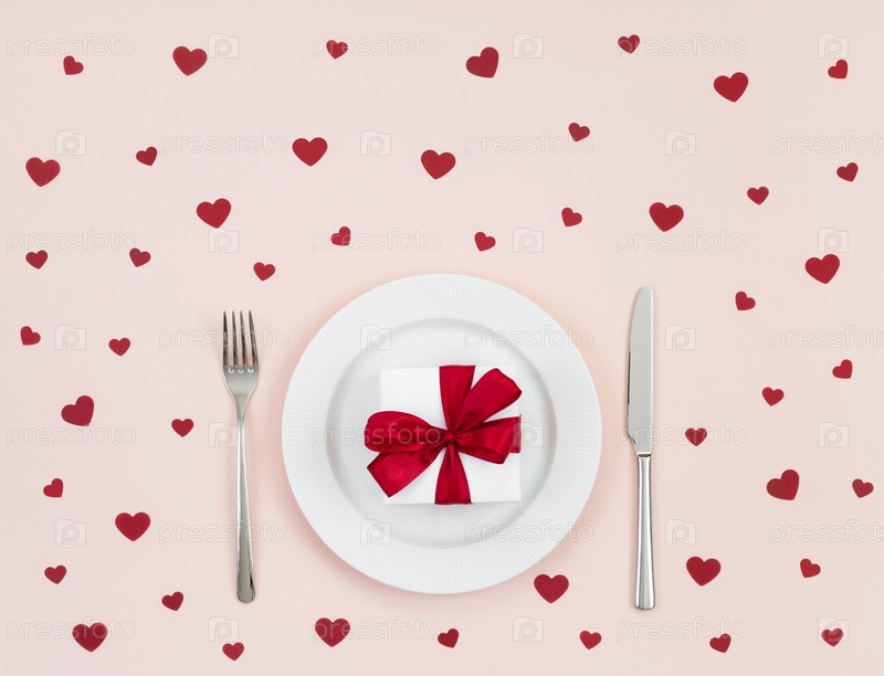 День святого Валентина или романтический ужин фон. Праздничная сервировка стола с красным подарком в тарелке и конфетти из сердец на розовом фоне