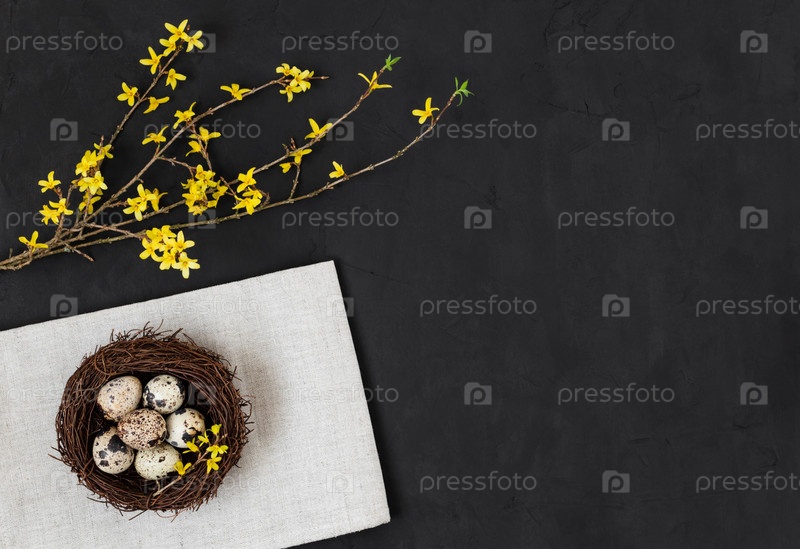 Пасхальная композиция с перепелиными яйцами в гнезде, салфеткой и желтыми цветами форзиции на черном фоне