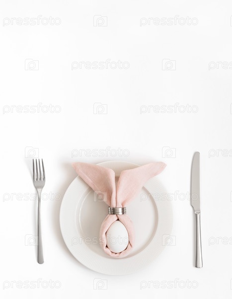 Сервировка пасхального стола с яйцом в розовой салфетке пасхального кролика на белом фоне. Вертикальная ориентация