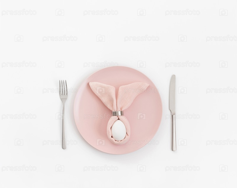 Сервировка пасхального стола с яйцом в розовой салфетке Пасхальный кролик на белом фоне