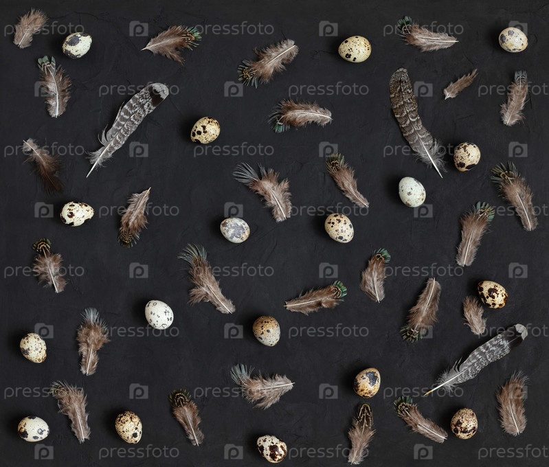 Пасхальный праздничный узор. Перепелиные яйца и перья на черном фоне. Минимальная концепция