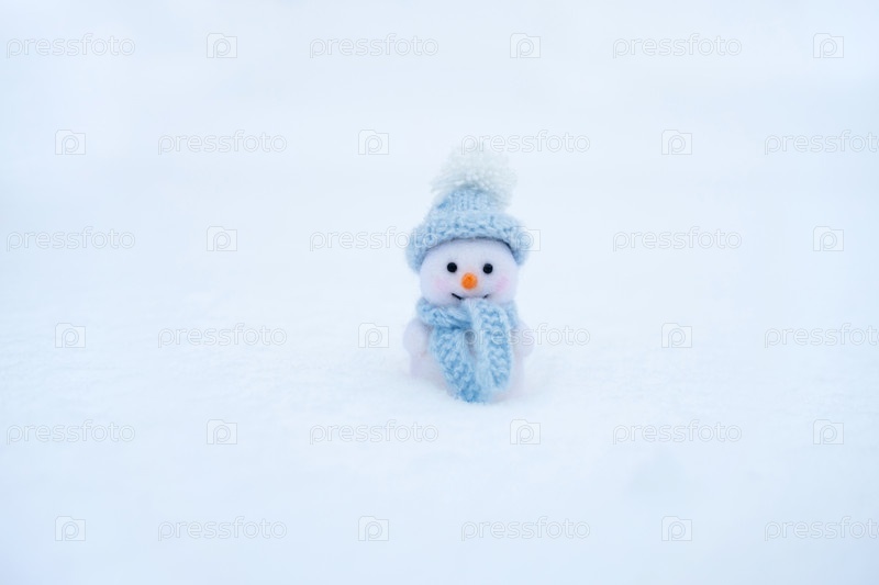Игрушка снеговика на фоне зимнего снега. Новогодняя игрушка из шерсти. С Новым Годом. Место для текста