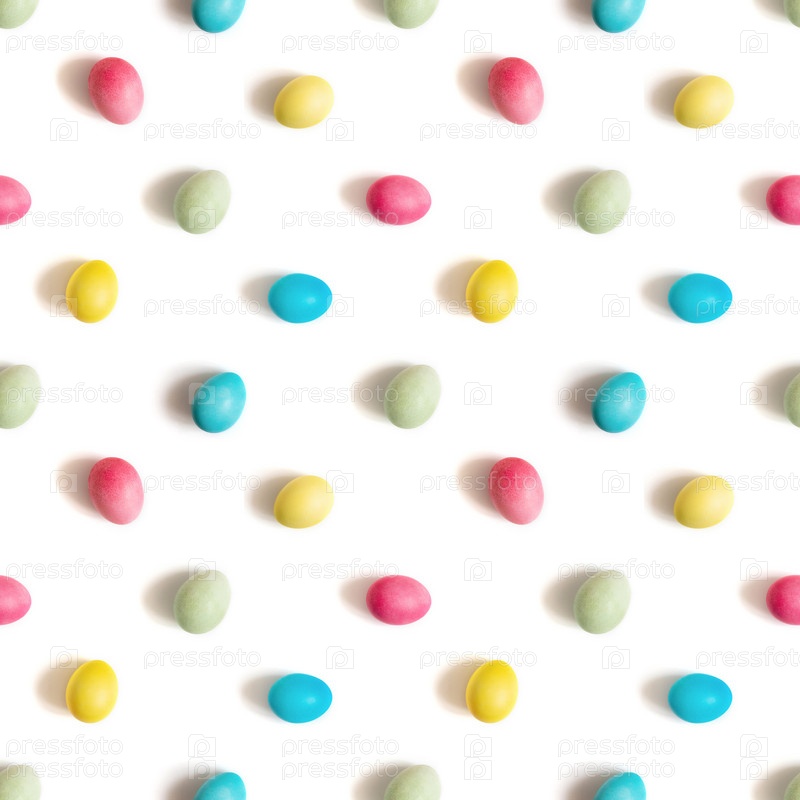 Бесшовный узор с красочными крашеными яйцами, выделенными на белом фоне. Пасхальная концепция. Вид сверху, плоская планировка