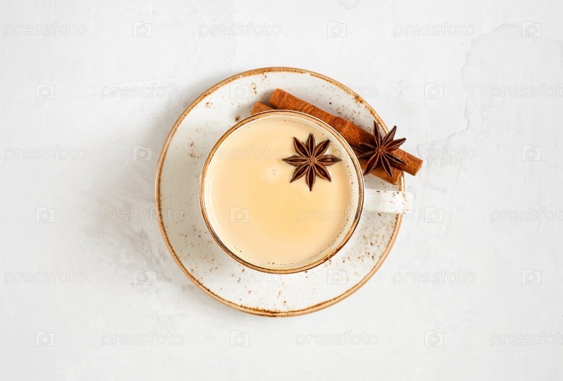 Чай масала. Индийский горячий напиток со специями и молоком. Латте на белом бетонном фоне. Вид сверху