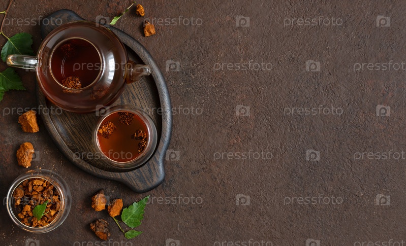 Состав чая чага, кусочки гриба чага, зеленые листья березы на коричневом фоне. Модный здоровый напиток. Скопируйте пространство, вид сверху, плоская планировка