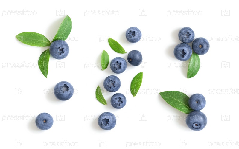 Набор черники, изолированные на белом фоне. Ягоды черники с зелеными листьями. Черника, черника. Вид сверху, плоская планировка